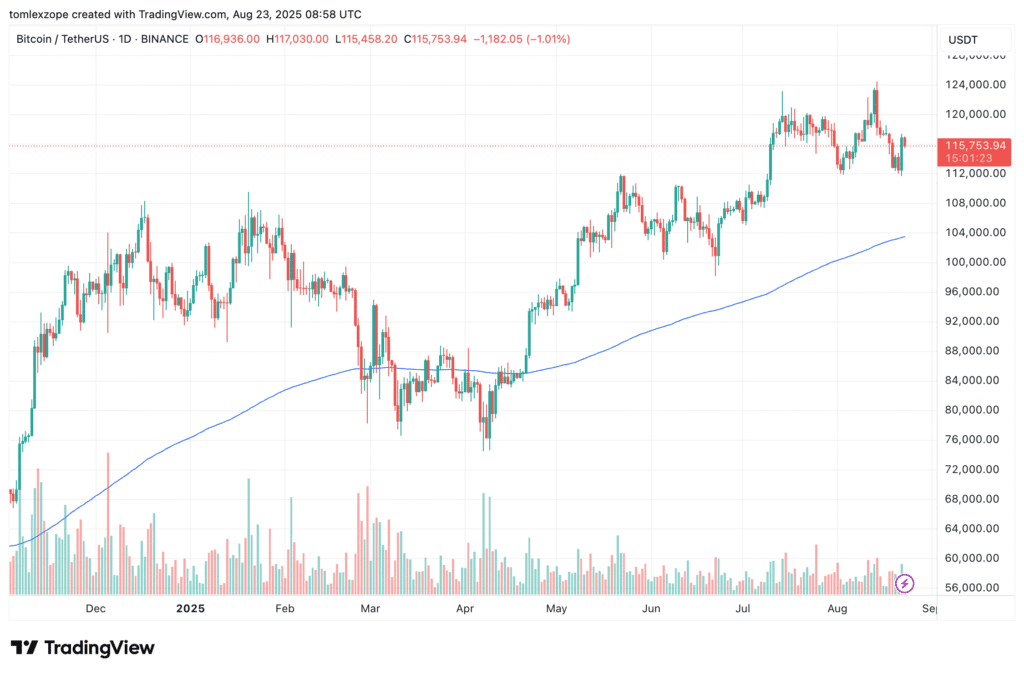 خلال الأسبوع الماضي، خضعت العملة الرائدة في السوق لضغوط هبوطية حادة، حيث انخفضت لفترة وجيزة دون مستوى 112,000 دولار أمريكي يوم الخميس 21 أغسطس، ومع ذلك، تفاعل سعر البيتكوين – وبقية السوق – بشكل إيجابي مع خطاب رئيس مجلس الاحتياطي الفيدرالي الأمريكي جيروم باول يوم الجمعة 22 أغسطس.