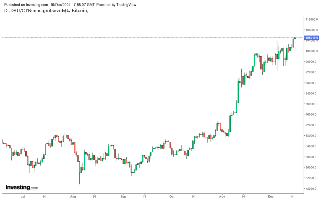 ارتفعت البيتكوين فوق 106 ألف دولار وبنسبة أكثر من 3% إلى مستوى قياسي بلغ 106,569.4 دولاراً أمريكياً، وتم تداولها عند 104,977.1 دولاراً أمريكياً بحلول الساعة 00:47 بالتوقيت الشرقي (05:47 بتوقيت جرينتش).