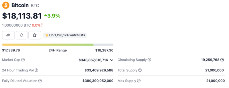 بافتراض أن سعر البيتكوين هو 18,113.81 دولاراً ، فإن القيمة السوقية لها هي 19,259,768 × 18,113.81 دولاراً = 348,867,816,716 مليار دولار. بمعنى آخر، القيمة الإجمالية لجميع المعروض المتداول من البيتكوين أقل بقليل من 349 مليار دولار.