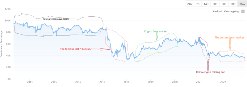 قبل عام 2017 ، سجلت Bitcoin هيمنة على السوق تجاوزت 80٪ – وأحياناً تصل إلى 95٪. هذا بسبب وجود عدد قليل من العملات الرقمية التي تتمتع بميزة تنافسية قوية. ومع ذلك، بعد تشغيل الاستثمار الأولي للعملة (ICO) لعام 2017 ، بدأت العملات البديلة بقيادة Ethereum (ETH) في جذب استثمارات كبيرة، مما قلل من هيمنة Bitcoin.