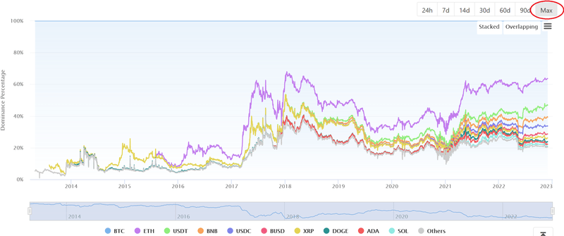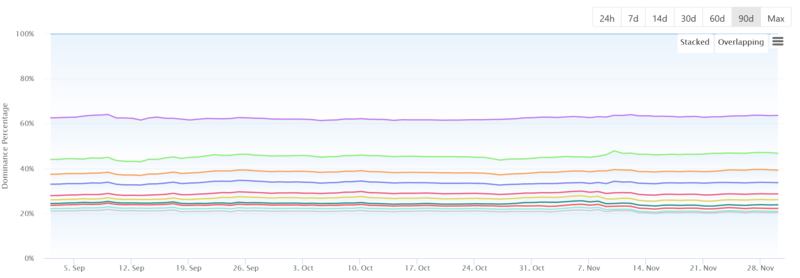 بصرف النظر عن إظهار هيمنة البيتكوين على السوق ، يحتوي الرسم البياني على هيمنة 10 عملات بديلة، ولكل منها لون مختلف لسهولة التعرف عليها.