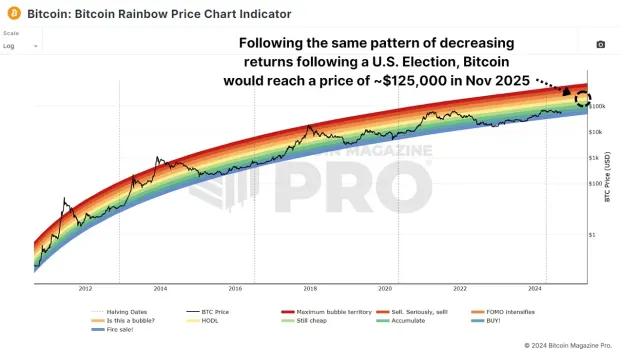 إذا حققنا نفس النسبة المئوية للمكاسب في الـ 365 يوماً التالية للانتخابات كما فعلنا في عام 2012، فقد يرتفع سعر البيتكوين إلى مليون دولار أو أكثر. إذا مررنا بنفس تجربة انتخابات عام 2016، فيمكننا أن نرتفع إلى حوالي 500000 دولار، وقد يشهد شيء مشابه لعام 2020 250000 دولار من عملة البيتكوين.