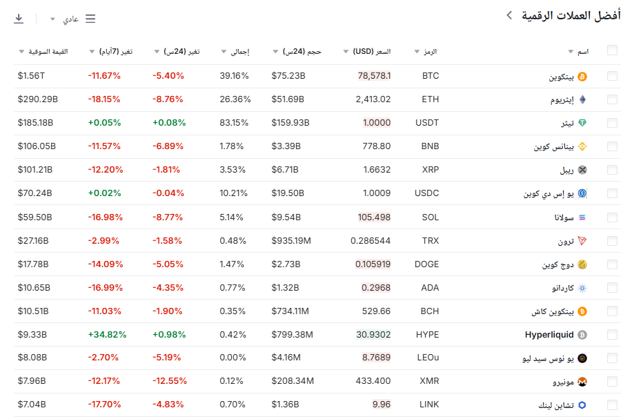 في تفاصيل انهيار البيتكوين دون 75 ألف دولار، شهدت سوق العملات الرقمية هزة عنيفة اليوم الأحد، حيث انزلق سعر البيتكوين إلى ما دون مستوى 80,000 دولار للمرة الأولى منذ أبريل 2025 أمس السبت واستكمل الهبوط اليوم إلى 78,800 هبوطًا بـ 5% في الـ 24 ساعة الأخيرة و11.6% هذا الأسبوع.