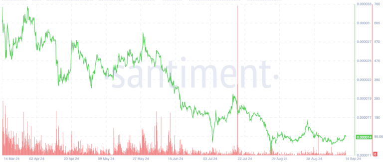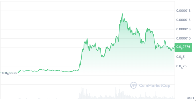 تهدف Pepe (PEPE)، وهي عملة ميمية قائمة على Ethereum، إلى عكس النجاح الفيروسي للتوكنات المميزة مثل Shiba Inu وDogecoin. لقد ظهرت كشخصية مهيمنة في ساحة العملات الرقمية. اعتباراً من وقت إعداد التقرير، يبلغ سعر PEPE 0.000007804 دولاراً أمريكياً، مما يمثل زيادة بنسبة 5% في اليوم الأخير.