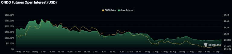 وفقاً لبيانات Coinglass، أظهر نشاط التداول لـ ONDO حركة كبيرة. ارتفع حجم التداول بنسبة 14.39% ليصل إلى 86.49 مليون دولار. وفي الوقت نفسه، شهدت الفائدة المفتوحة أيضاً زيادة ملحوظة بنسبة 2.26%، حيث ارتفعت إلى 83.14 مليون دولار. تسلط هذه الأرقام الضوء على الاهتمام المتزايد وبيئة التداول النشطة لشركة ONDO في الأسواق المالية.