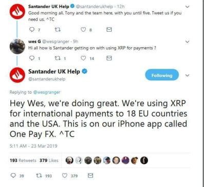 في رد على تدوينة على تويتر، قال حساب البنك الذي يعتبر أحد أكبر البنوك الدولية المعروفة، إن عملية الدفع عبر عملة الريبل الرقمية (XRP) أصبحت ممكنة من خلال تطبيق One Pay FX التي تم إطلاقها العام الماضي.